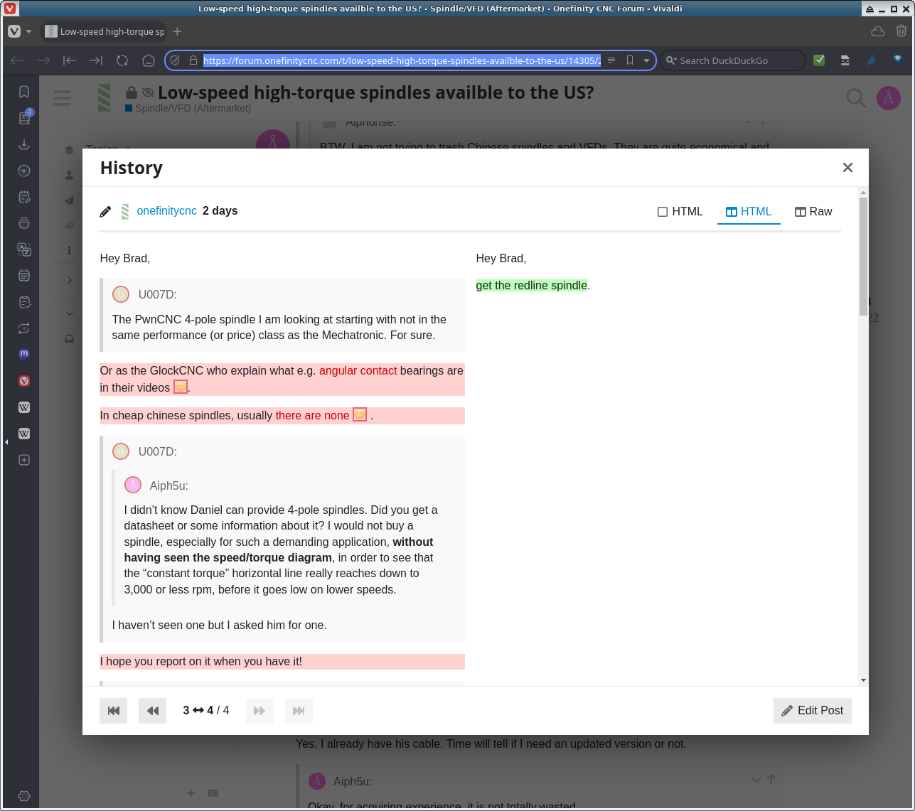 Aiph5u's cnc newsImportant newsOn 2025-02-10, Kirbre, Inc., Canada, the operators of the www-based Onefinity CNC forum forum.onefinitycnc.com, manipulated over sixty forum posts whose author I was to create the impression that I endorse or recommend their new product, the Redline spindle/VFD. In some cases, complex forum posts were completely replaced by the simple statement that you should buy their Redline product, making it appear as if I had written this in the forum (e.g. like shown here ()). This was done against my will. This also happened to other forum participants. Hundreds of forum posts were manipulated to replace "PwnCNC" by "Redline", as if the forum users had written that in the past (even in the lots of old posts when Redline didn't even exist yet) The purpose of the manipulation seems to have been to remove any mention of the innovative and ingenious Plug-and-play Spindle/VFD product () that Daniel Moran with its PwnCNC () company had created and which he offers for the Onefinity (both for Masso G3 and Buildbotics versions) from all Onefinity forum posts, regardless who the author was, with the obvious intention that forum readers would only buy Onefinity's new spindle/VFD product labeled "Redline" instead, a quasi-clone of Daniel Moran's PwnCNC spindle/vfd product. The Redline product contains the same G-Penny spindle and DELIXI VFD as PwnCNC's original product. Even the WS16 spindle connector that Daniel Moran took so long to find and Daniel's huge development and research work on his VFD enclosure product, VFD wiring and programming knowledge as well as information from PwnCNC web site was taken on by Onefinity without any attribution. In the past, PwnCNC's plug-and-play spindle/VFD product was explicitly mentioned by Onefinity as an alternative motor variant instead of the Makita hand trim router, and was, although unsupported by them, an official option for Onefinity CNC machines, as you can see here () (from web.archive.org ()). In the last few years, many Onefinity customers ran their Onefinity CNC machine with Daniel Moran's PwnCNC vfd/spindle system with big success and to their great satisfaction (and they still do), and it was a frequent topic in the Onefinity forum. But when Onefinity one day offered a clone of Daniel's spindle/vfd enclosure product, Onefinity tried to manipulate all these individual postings and discussions and either replaced "PwnCNC" by "Redline", in a way to create the impression that their new clone product called "Redline" had been a forum topic in the past (although it even didn't yet exist), or by simply deleting posts covering the PwnCNC vfd/spindle product. After the manipulation of the Onefinity forum archive was completed, any occurrence of PwnCNC's original spindle/VFD product, his PwnCNC company, or its name, had vanished. Furthermore, Onefinity now explicitly do not exclude the possibility that using the PwnCNC spindle/VFD may void the customer's warranty () for their Onefinity CNC machine. From onefinity-firmware version 1.6.0 on, they've also removed the "PwnCNC VFD" selection item in the 'TOOL' section of their Buildbotics ()-forked () CNC Controller (now it is simply referred to as the "EM60" item). Don't let you fool by this, your PwnCNC spindle still works as nicely as before on your Onefinity CNC controller! It does on the original Buildbotics () CNC Controller natively too, as it always did, and is excellently supported by Buildbotics. Buildbotics, in contrast to Onefinity, still work together with PwnCNC, and, by the way, the support for the DELIXI EM60/EM61 Series VFDs was integrated into the Buildbotics source code by Doug Coffland () and not by Onefinity. It was Daniel@PwnCNC who gave the support for the DELIXI EM60 Series VFDs to Onefinity. You may also have a look at Daniel Moran's PwnCNC Spindle System Compatibility & Facts FAQ (). To summarize, I think you could say that as long as Daniel was providing support to Onefinity's customers, he had Onefinity's goodwill, but when they had learned everything they needed from him to replicate his product and offer it themselves, they threw him away. Kirbre Inc. did not respond to a request for comment. I consider such behaviour as an absolute no-go, because manipulating someone's postings this way is a form of identity theft and abuses the confidence that the forum contributors and customers of Onefinity had in the company. I emphasize that I am in no way affiliated with Kirbre Inc., Onefinity CNC, or Redline, and that I do NOT endorse or recommend the products of these companies. -- Aiph5u News updateUpdate as of 2025-05-20 13h46 CESTPS: You may be interested in reading this meanwhile deleted thread on the Onefinity CNC forum: Censorship on the 1F forum – Onefinity CNC Forum () Breaking NewsUpdate as of 2025-05-21Okay folks, now it's official. ()
